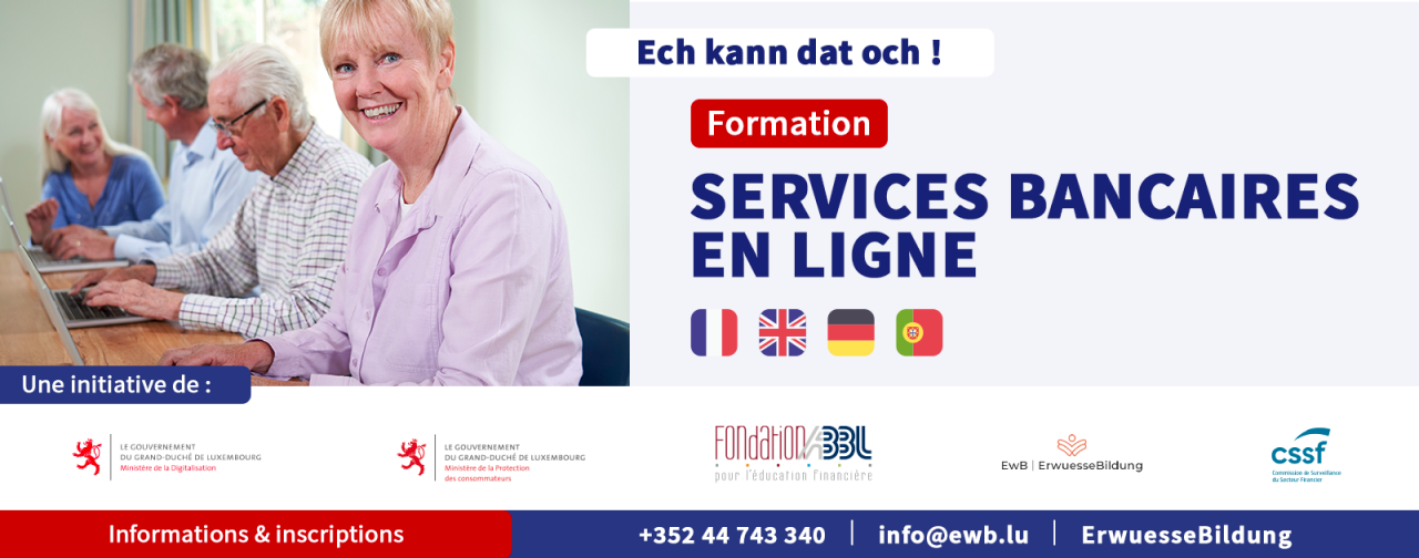 Le ministère de la Protection des consommateurs, le ministère de la Digitalisation, l'Erwuessebildung, la Fondation ABBL et la CSSF ont lancé une formation dans laquelle les participants apprennent les bases de l'online banking afin de pouvoir effectuer leurs démarches bancaires depuis leur ordinateur en toute sécurité.
